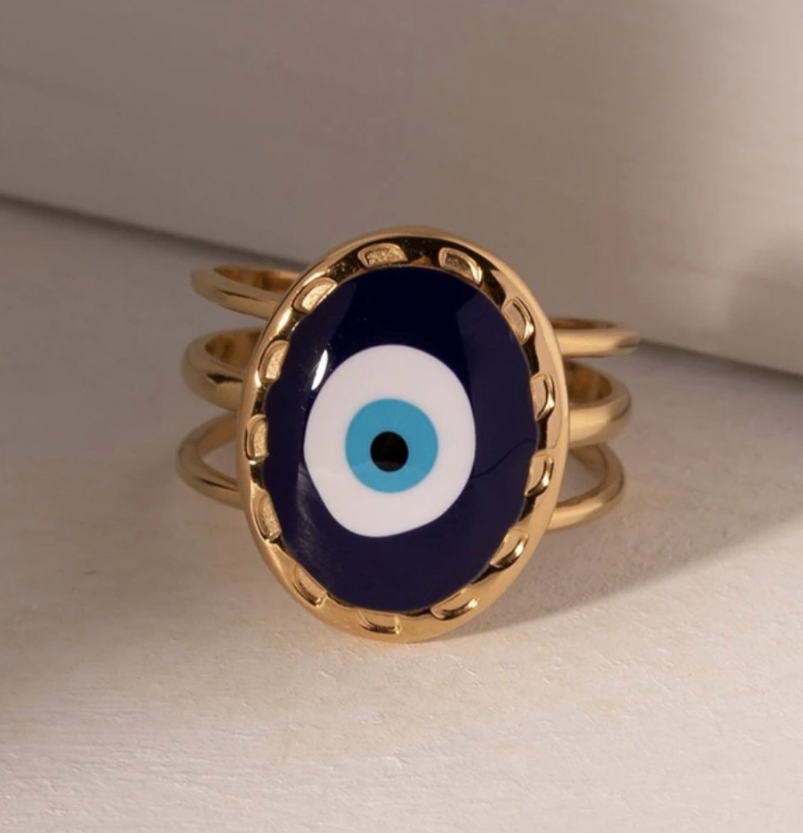 A charm that protects — and stuns. The Nazar Ring features the iconic evil eye design in striking blue, white, and black enamel, set in a bold gold frame. With its triple band structure, this piece balances spiritual meaning with high-style energy, making it your perfect everyday amulet.