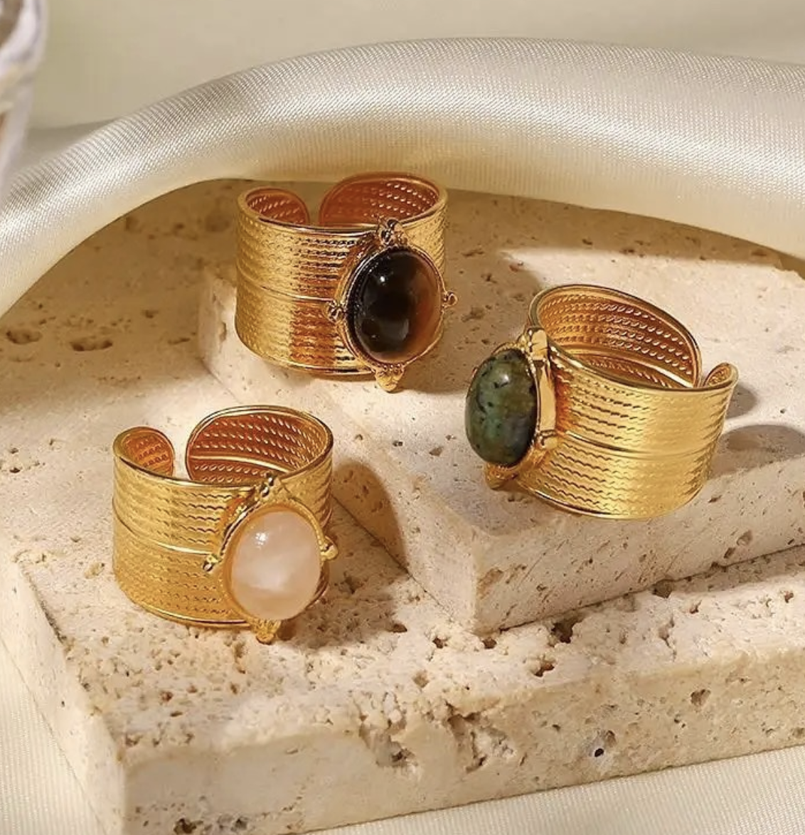 Elegant with a playful twist β the Jade Ring is a chunky, open-band design that offers both comfort and statement style. With its adjustable fit and three dreamy color variants β Matcha (green), Blush (light pink), and Chocolate (brown) β itβs made to suit every mood and moment.