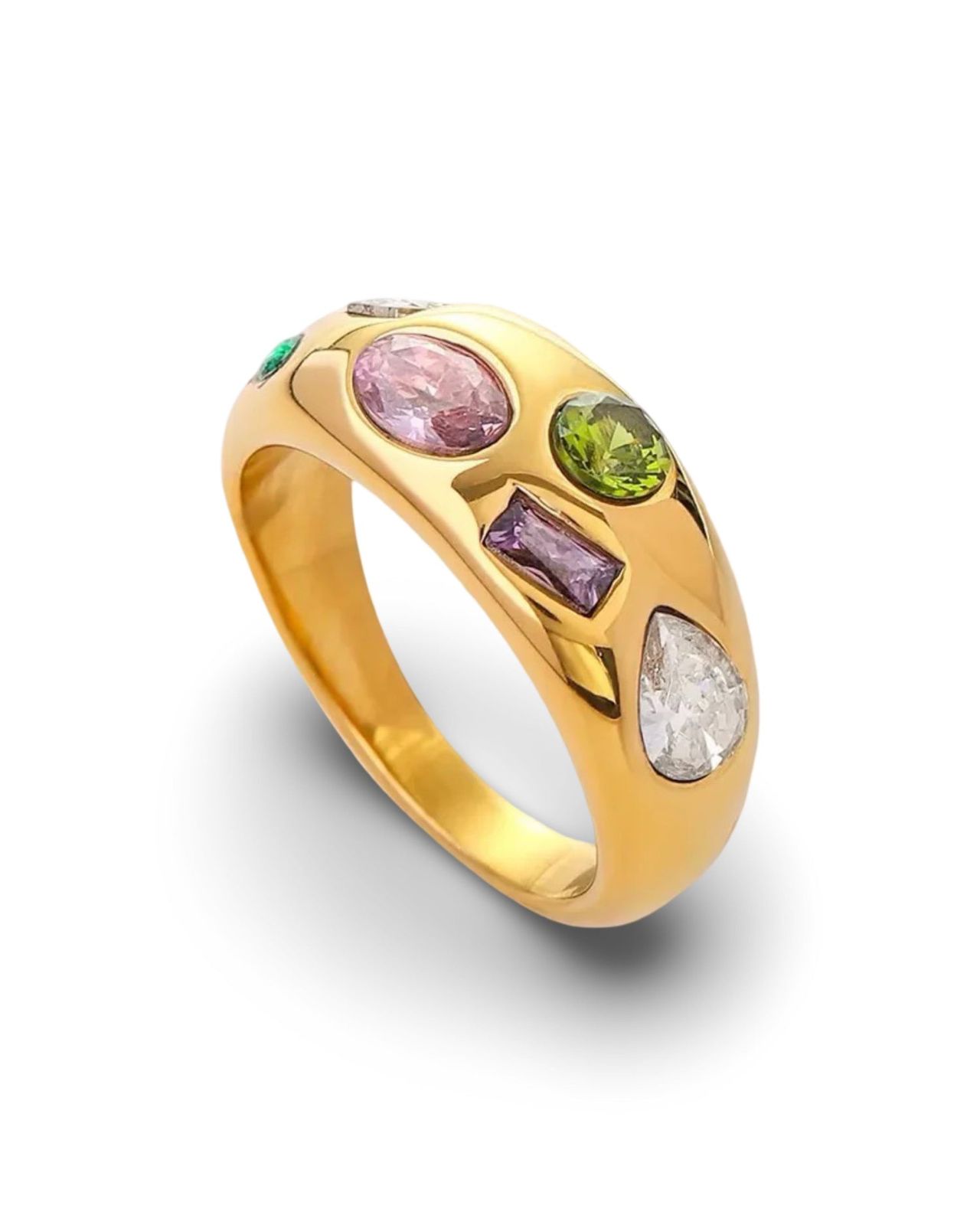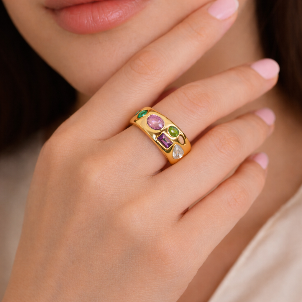 Bold yet refined, the Mosaic ring is designed to stand out effortlessly. Featuring a smooth gold-tone band adorned with multi-shaped pastel crystals, this piece blends color, elegance, and modern charm in one striking design. Crafted from high-quality stainless steel with a tarnish-free finish, it offers comfort and durability without compromising on style. Wear it solo and let the colors speak — a statement ring made for confident, everyday elegance.